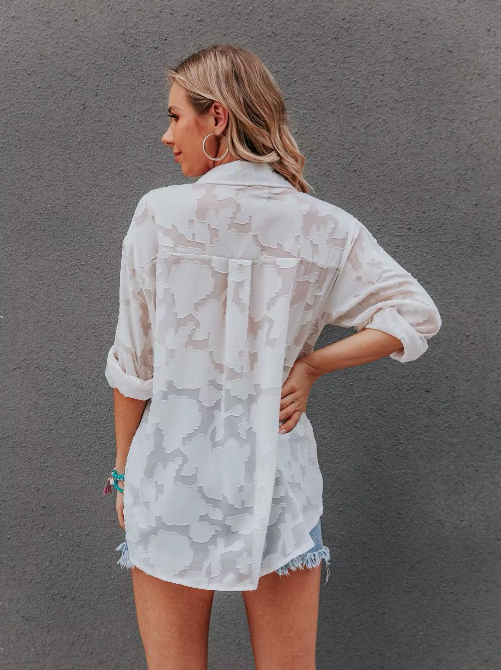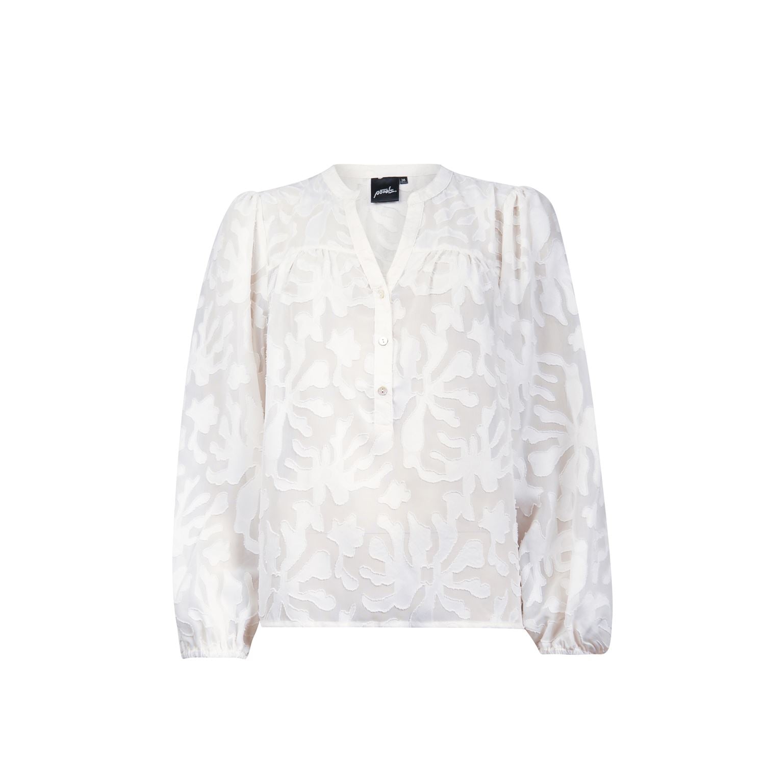 Den här lätt transparenta blusen är dekorerad med ett diskret burn-out-blommönster som ger ett vackert och levande uttryck. De små fransarna längs mönstret ger en romantisk känsla – perfekt både till vardags och fest.
