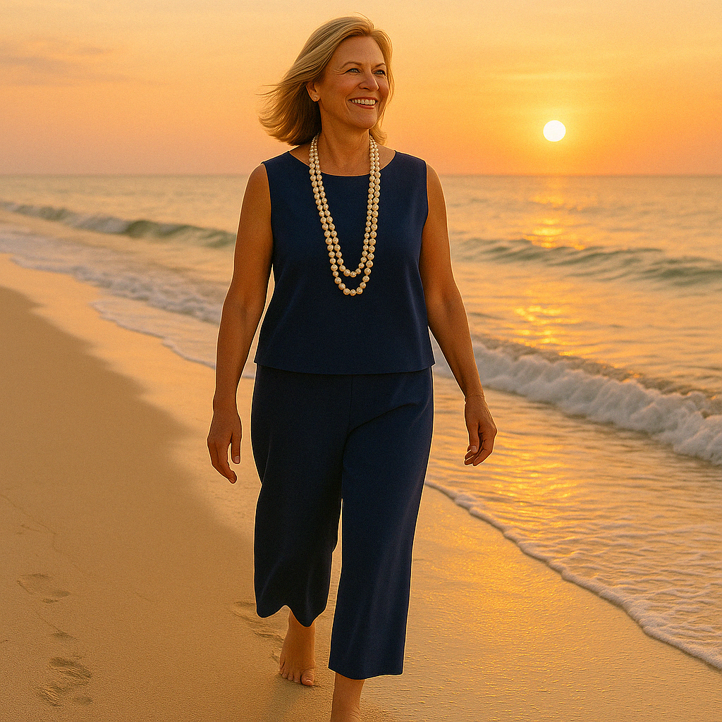 En avslappnad kombination av komfort och elegans. Cecilia-setet är särskilt designat för kvinnor som vill känna sig fina utan att kompromissa med bekvämlighet. Lätt, andningsbart och smickrande – perfekt för soliga dagar, semestern eller bara avslappnade stunder med stil.