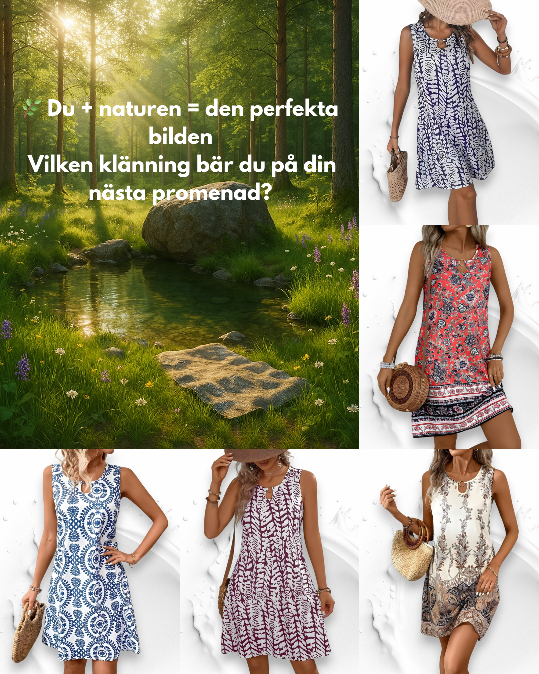 🌸 Låt din stil blomstra i denna färgstarka boho-chica sommarklänning! En perfekt kombination av stil och komfort, med en luftig passform och ett lekfullt etniskt mönster. Den eleganta halsringningen med ringdetalj ger en subtil touch av glamour.