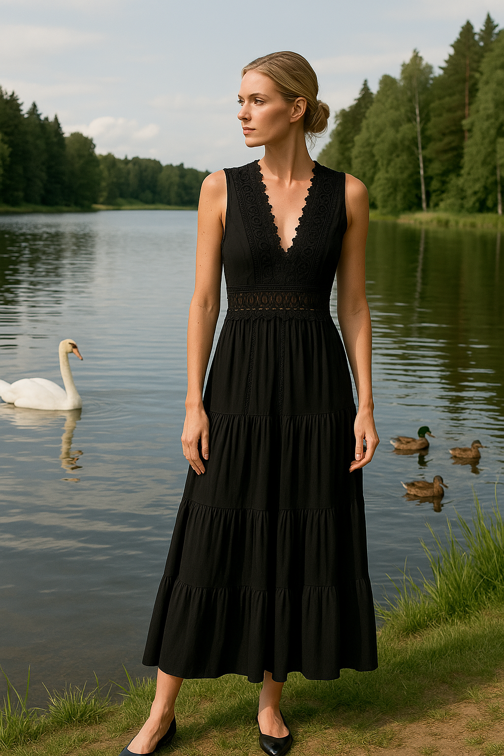 Tänk dig detta: en utekväll eller en speciell tillställning, du i Sara™ Elegant Spets V-ringad Klänning, som ger ditt självförtroende ett lyft. Det delikata spetsdetaljerna och den fina V-ringningen omfamnar din kropp med feminin flair, medan den luftiga, ärmlösa designen gör att du känner dig både bekväm och elegant hela dagen. Denna klänning kombinerar stil och komfort på ett sätt du inte vill missa!