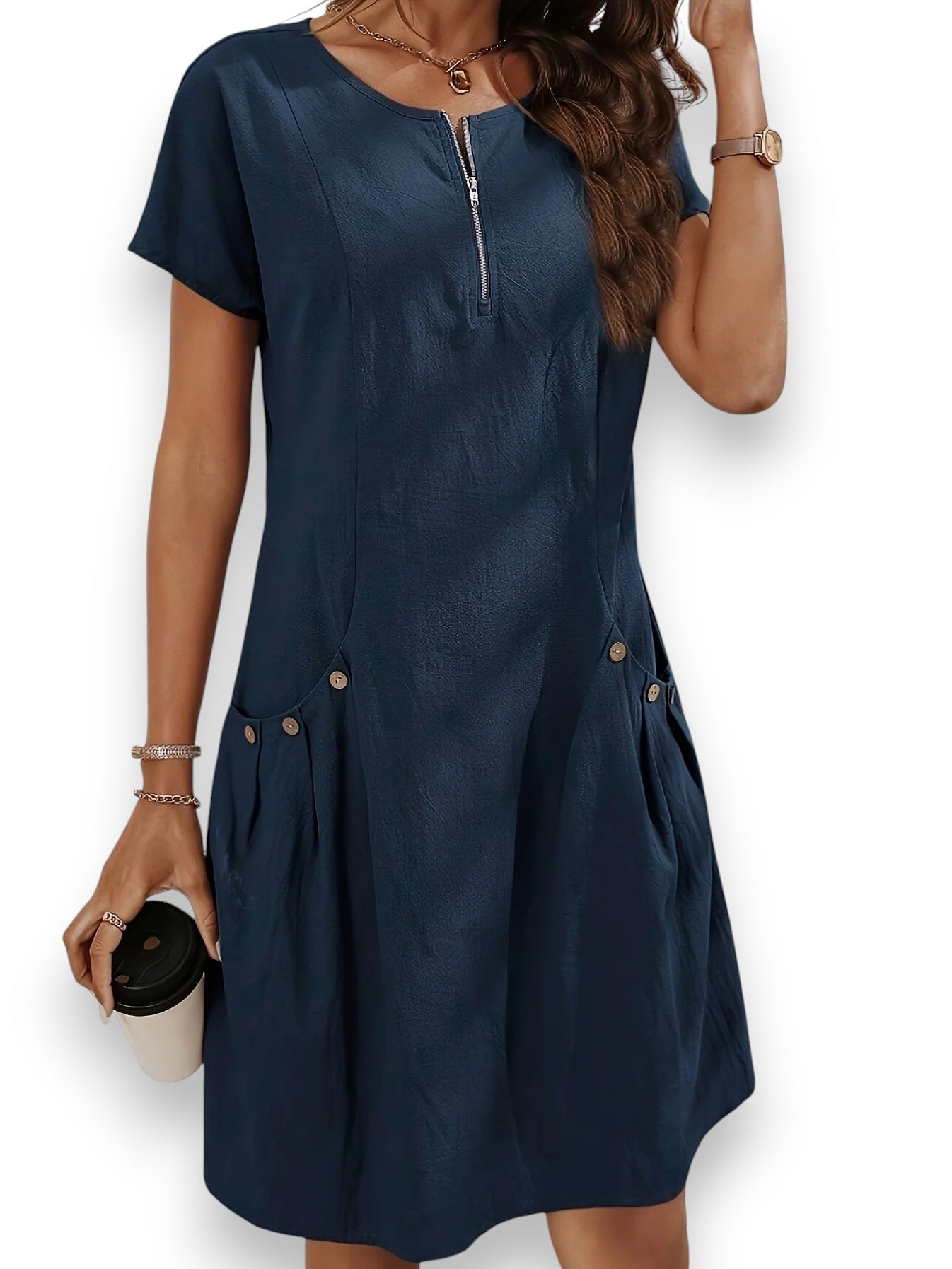 Den mellankorta längden, rund halsringning och dekorativa knappar framtill ger dig en stilren och avslappnad look.