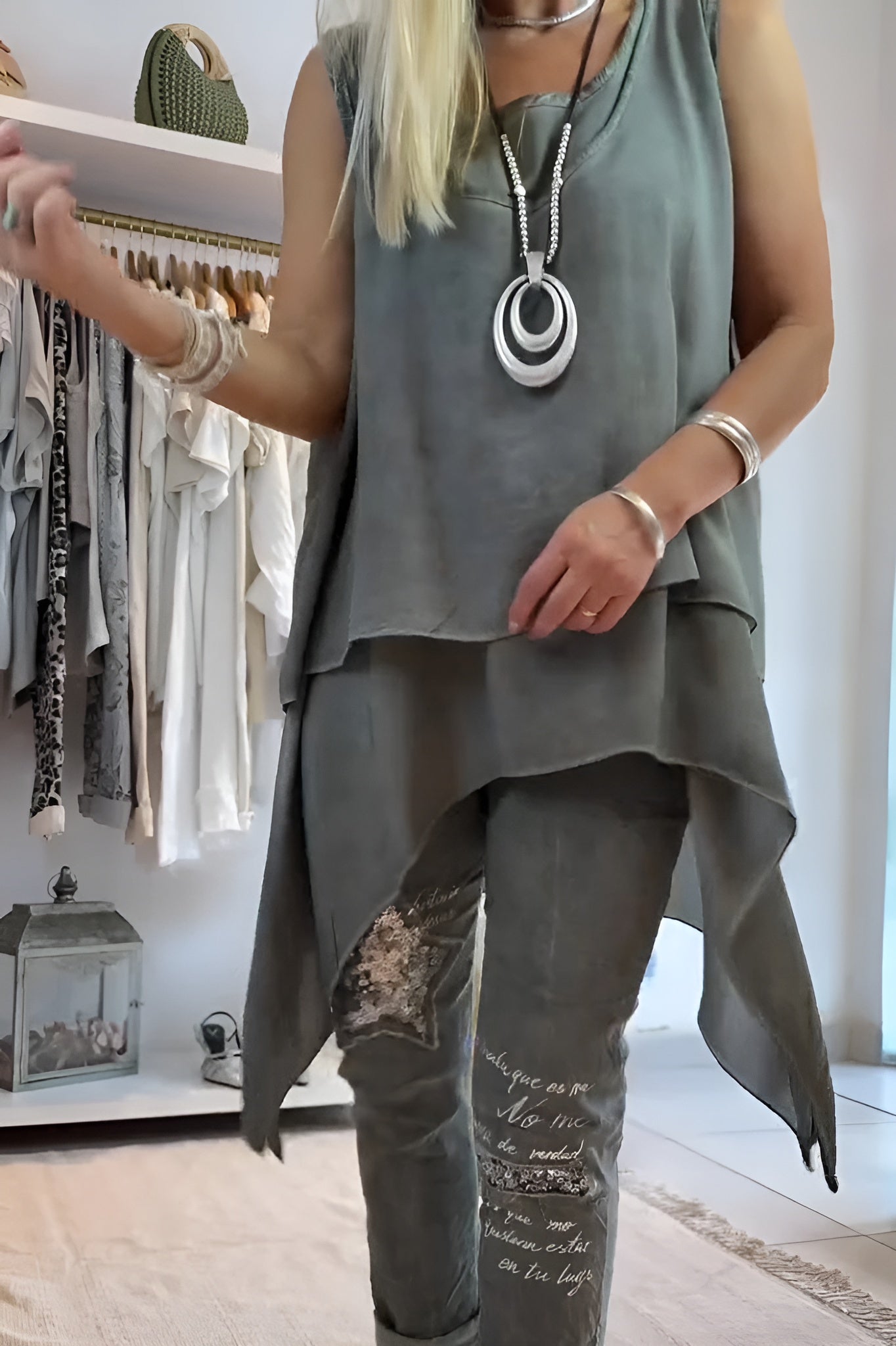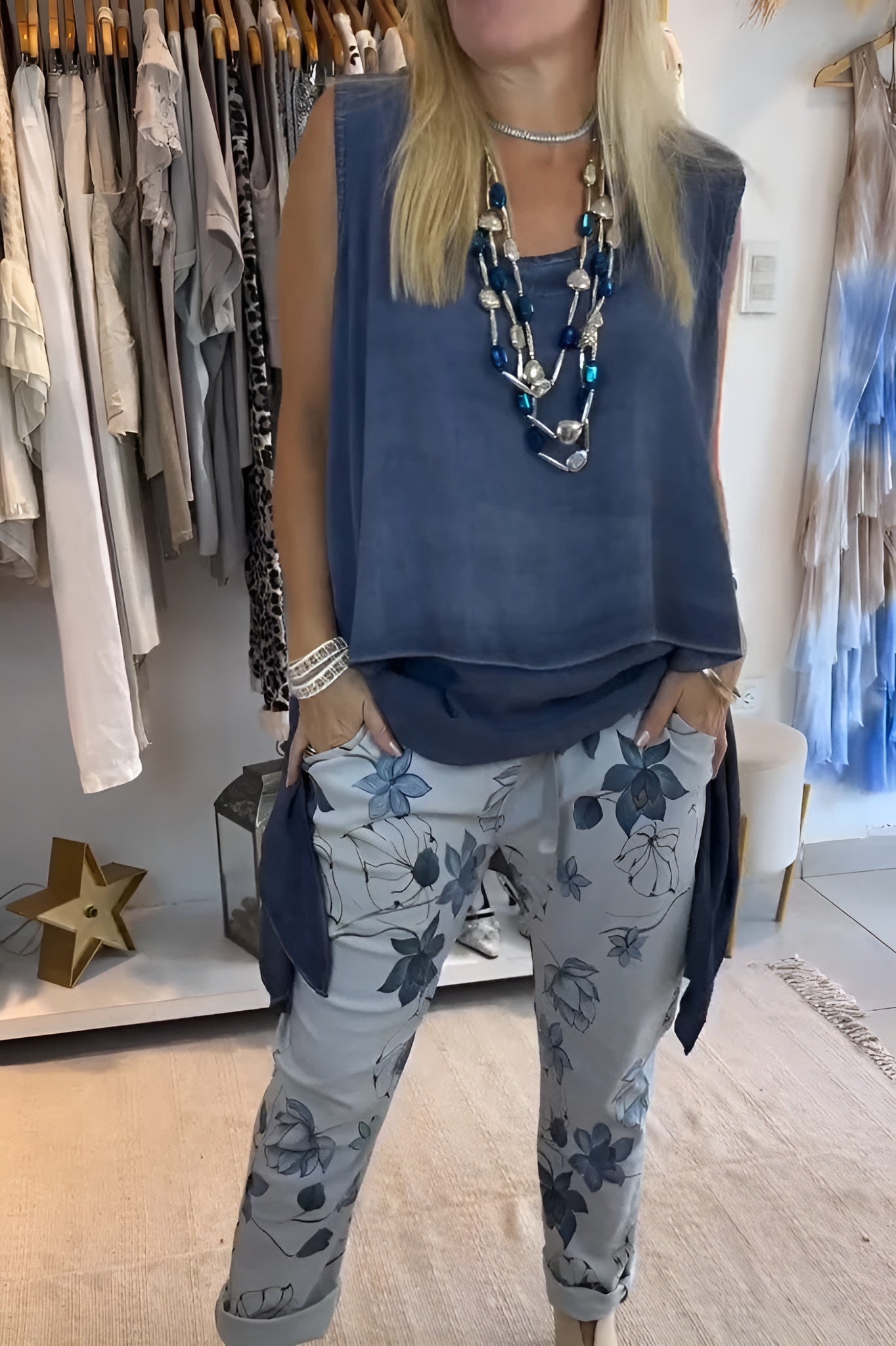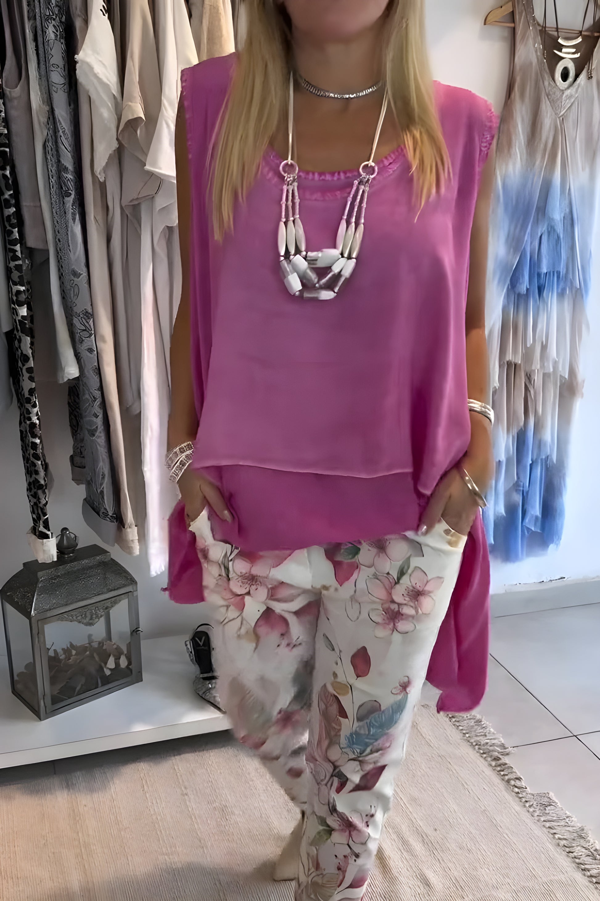 Upptäck Susanne™ – en elegant tvådelad outfit med ärmlös topp och vida byxor i livfullt mönster. Perfekt för både vardag och speciella tillfällen.